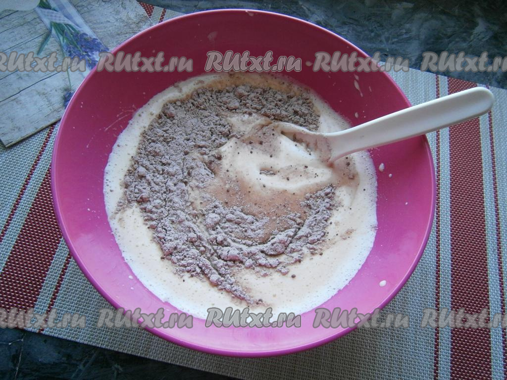 К какао-порошку добавить муку и разрыхлитель, перемешать сухую смесь.