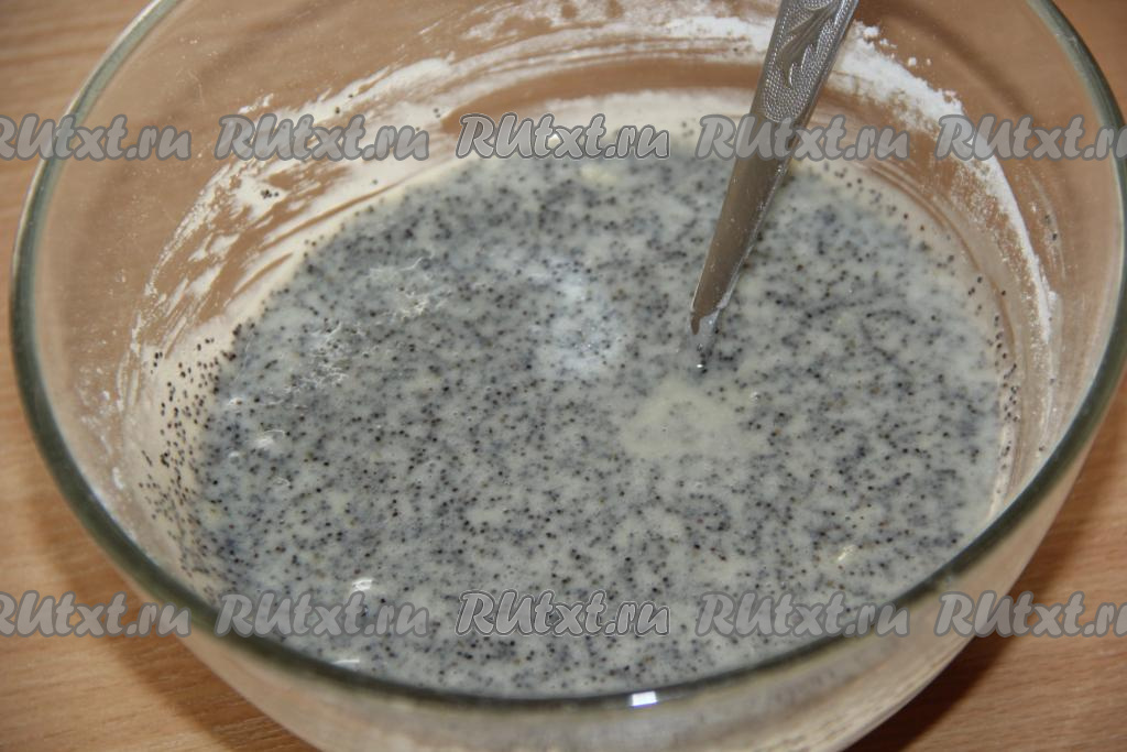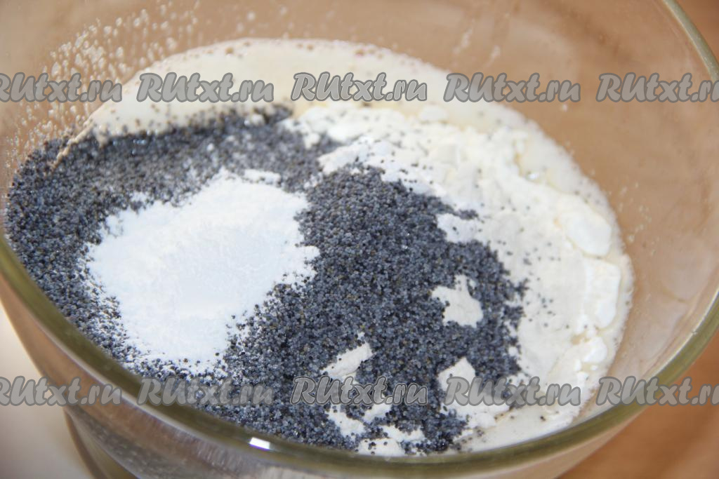 Перемешать массу и всыпать муку, разрыхлитель, мак, крахмал и соль.