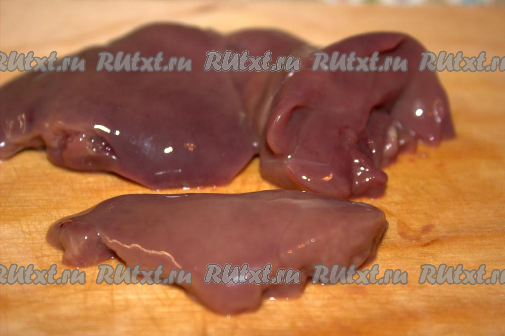 Куриную печень замочить в холодной воде, чтобы из неё вышла вся кровь. Затем срезать с печёнки все плёнки и прожилки. Тщательно промыть печень под проточной водой и разрезать пополам.