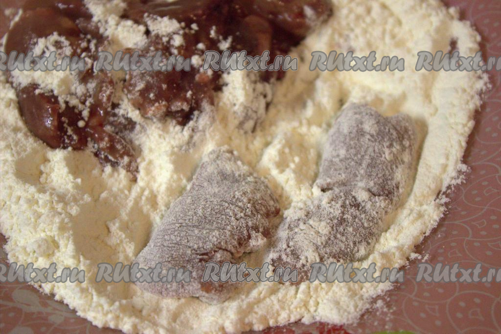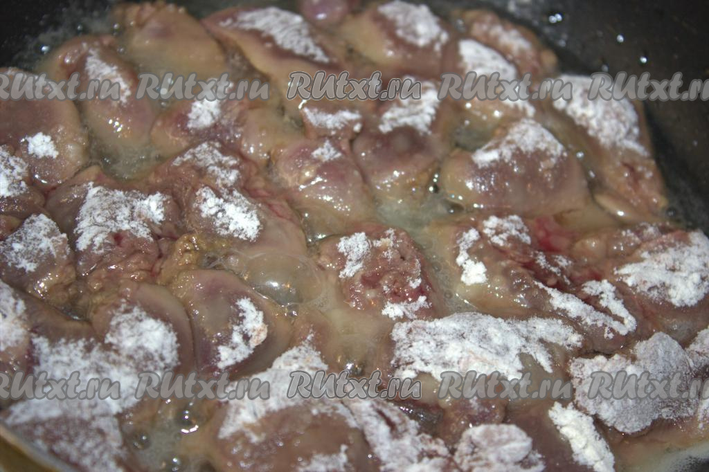 В миску всыпать муку и в ней обвалять каждый кусочек куриной печени со всех сторон.