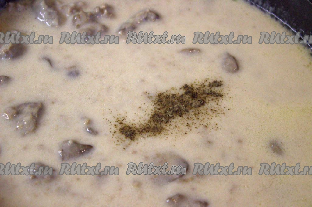 Влить тонкой струйкой в сковороду к печёнке приготовленную смесь из сметаны и муки, аккуратно перемешать.