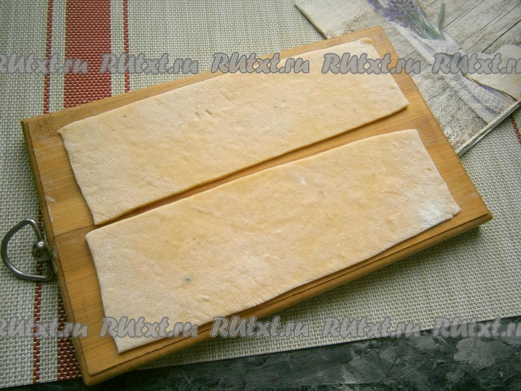 Тесто разделить на 2-3 части. Каждую часть теста раскатать в тонкий пласт. Обрезать края так, чтобы получились полосы шириной около 4-5 см.