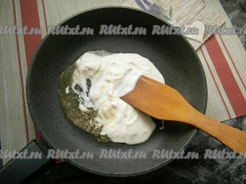 В сковороде разогреть сливочное масло, добавить сметану комнатной температуры, немного посолить и перемешать. Прогреть сметанный соус на небольшом огне, не доводя его до кипения.