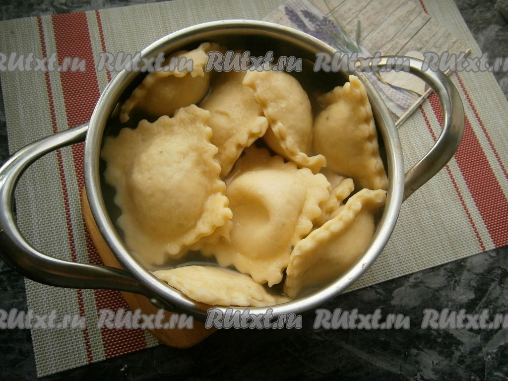 Влить в кастрюлю воду, отправить на огонь и довести до кипения, посолить. В закипевшую воду выложить равиоли, снова дать воде закипеть. Затем уменьшить огонь и варить равиоли в течение 5-7 минут (до готовности).