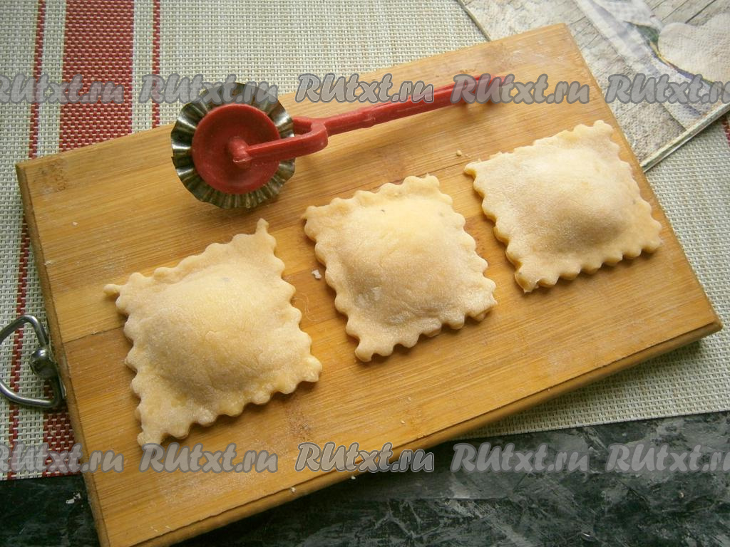 Квадраты с начинкой накрыть квадратами из теста, на которые не выкладывали начинку, прижать края. По желанию, обрезать края равиоли фигурным ножом.