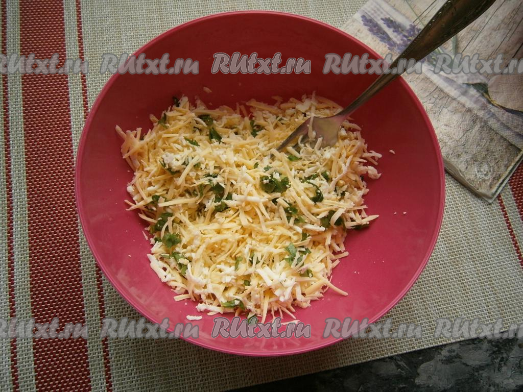 К натёртому сыру добавить измельчённую петрушку, перемешать и начинка для равиоли готова (немного начинки отложить в сторону - она нам понадобится для подачи).