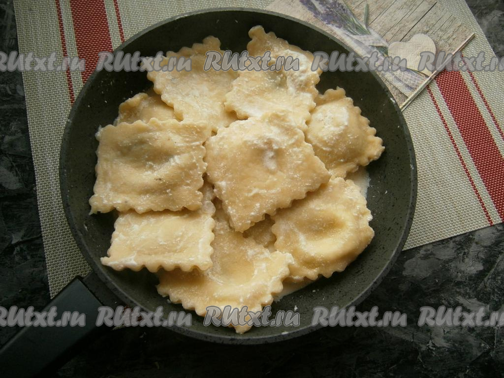 Шумовкой достать равиоли из воды и выложить в соус, перемешать. Прогревать их на слабом огне под закрытой крышкой около 2-3 минут.