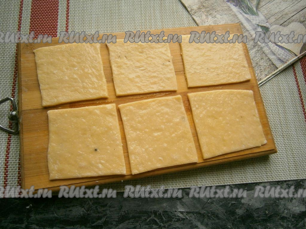 Разрезать получившиеся полосы на квадраты (размер каждого квадрата около 5х5 см). Немного смазать получившиеся квадраты взбитым сырым белком.