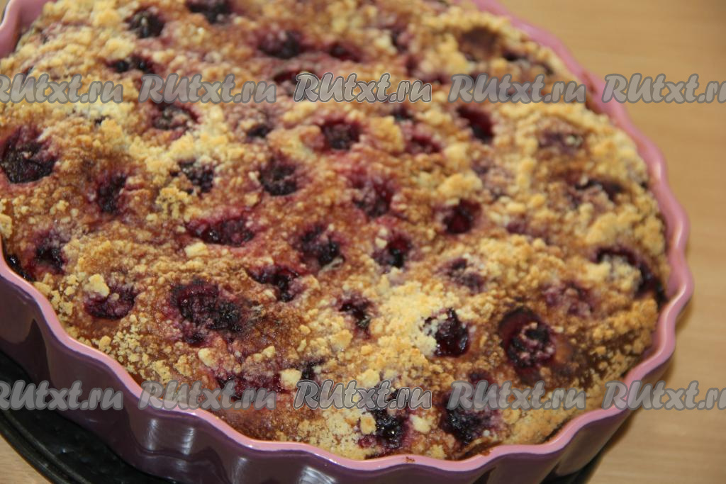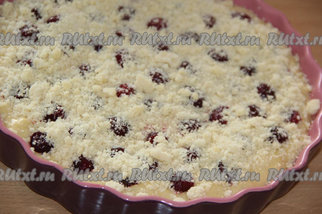Посыпать тесто с вишней приготовленной крошкой и поставить в разогретую духовку. Выпекать дрожжевой пирог с вишнёвой начинкой, примерно, 35-40 минут при температуре 200 градусов.