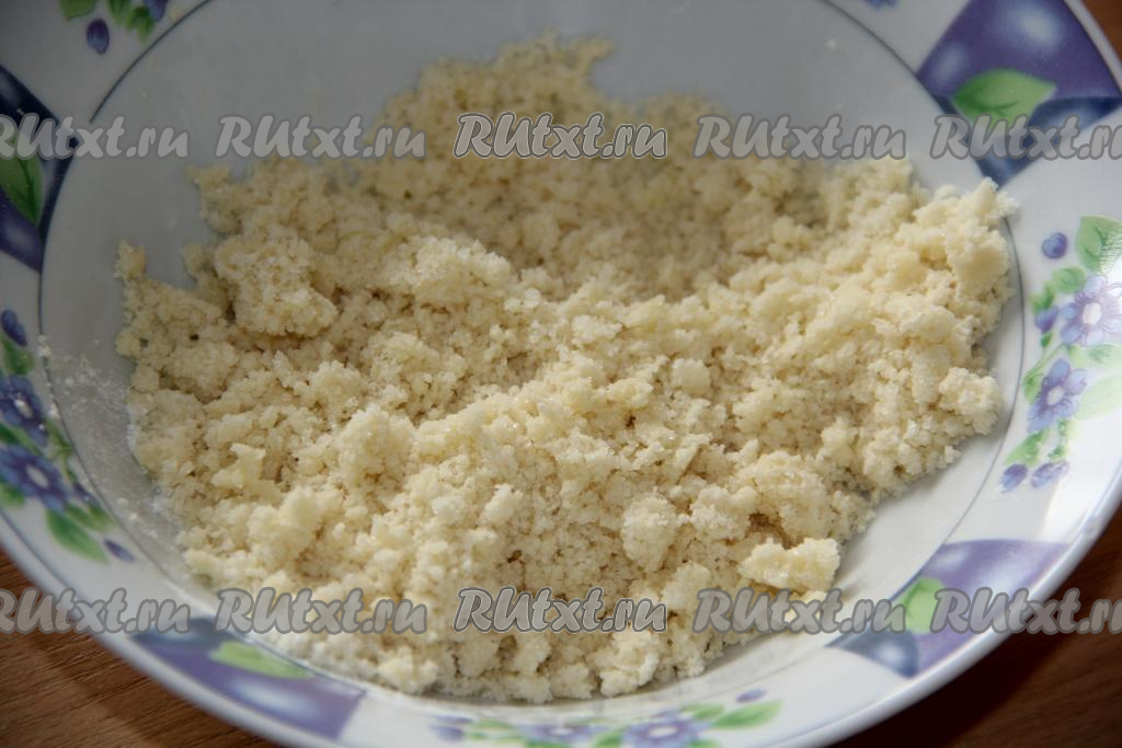 Для приготовления крошки соединить холодное сливочное масло, сахар, муку, ванильный сахар и перетереть руками в крошку.
