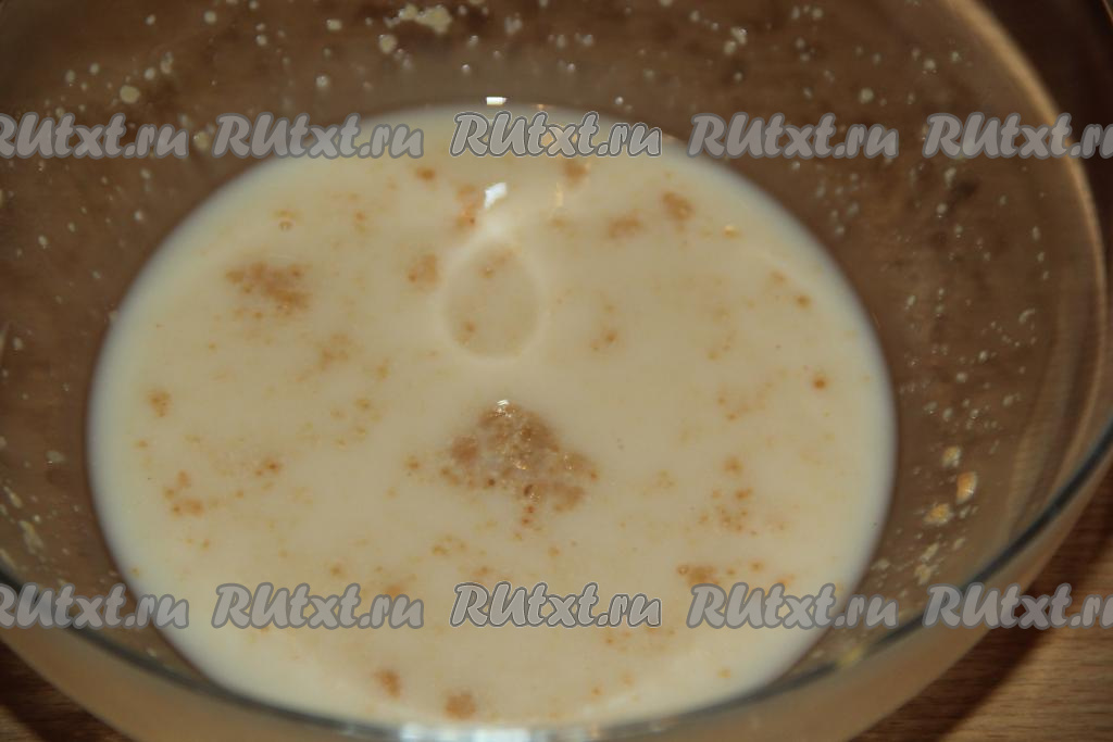 Для того чтобы замесить тесто, нужно тёплое молоко (температура молока не более 40 градусов) влить в миску, добавить сахар и сухие дрожжи, перемешать и оставить на минут 15-20. На поверхности появятся пузырьки.