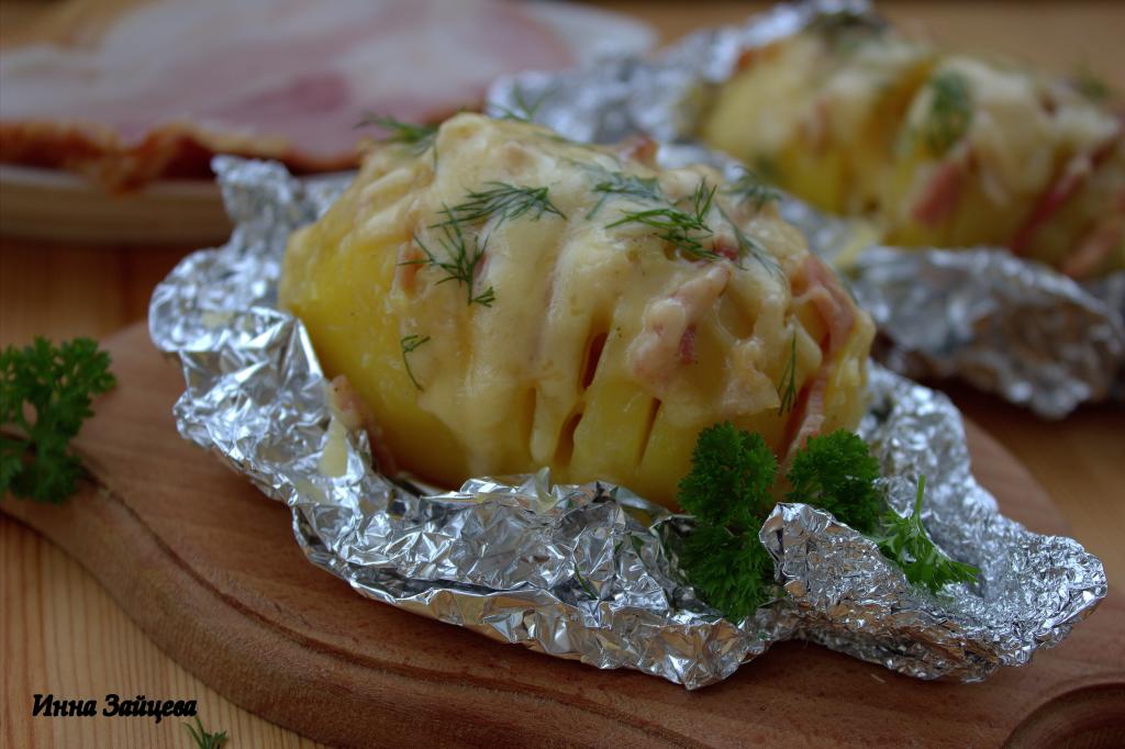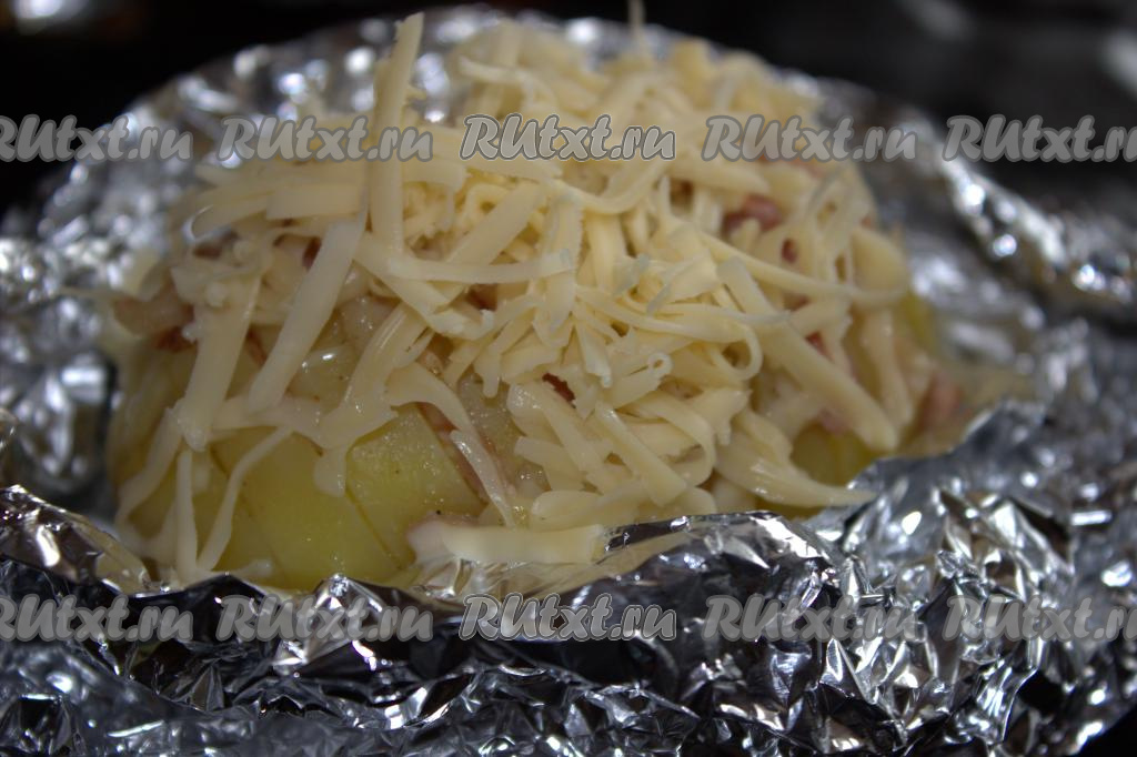 Готовую картошку-гармошку с беконом достать из духовки. Фольгу аккуратно развернуть и посыпать каждую картофелину сыром, натёртым на мелкой тёрке, и измельчённым укропом.