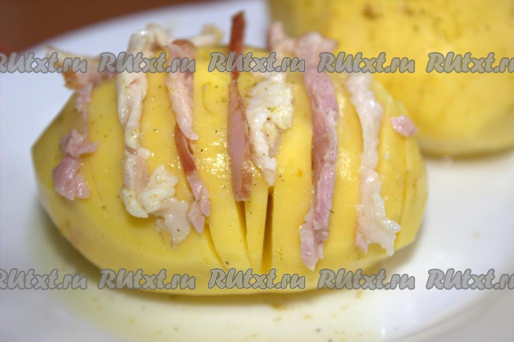В каждый разрез картошин поместить по ломтику бекона. Картошку посолить и приправить по вкусу специями.