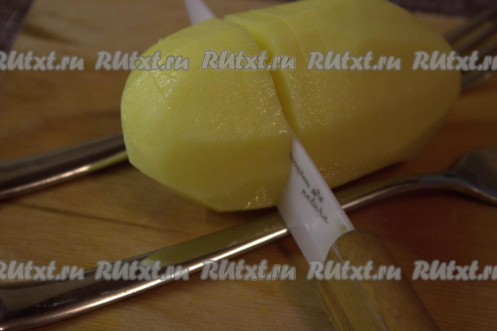 Острым ножом на поверхности каждой картофелины сделать поперечные надрезы на расстоянии, примерно, 0,5 сантиметра, не дорезая до конца. Удобно делать надрезы, положив картофелину между двух вилок или ложек (как на фото). Вилки (или ложки) станут "ограничителем", который поможет аккуратно надрезать клубень картофеля, не разрезав его полностью.