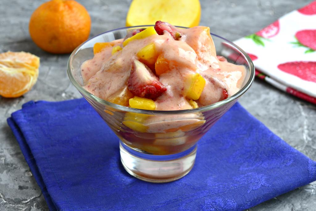 Полить получившейся ароматной йогуртовой смесью салат. Подать необычайно вкусный и полезный фруктовый салат с манго к столу.