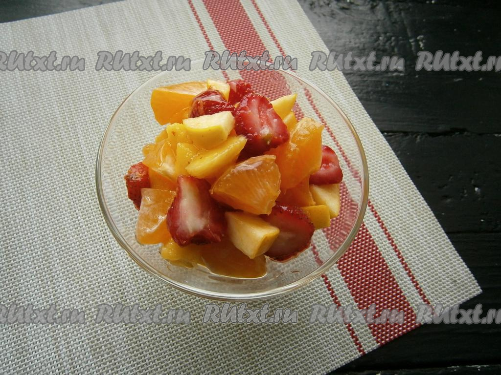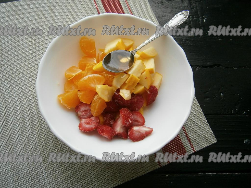 Сюда же добавить яблоко, нарезанное небольшими кубиками. Фруктовый салат с манго полить жидким мёдом.