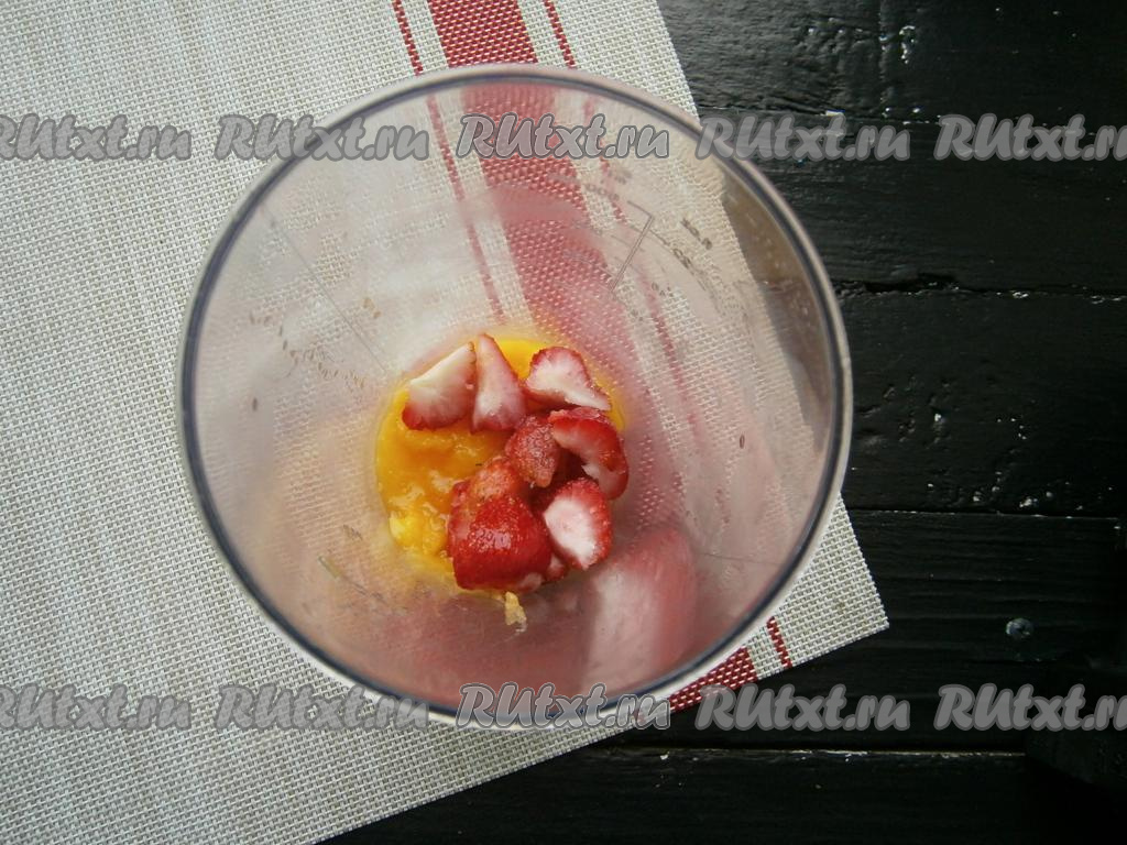 Оставшуюся мякоть манго поместить в стакан блендера, пюрировать погружным блендером. Добавить оставшуюся клубнику.