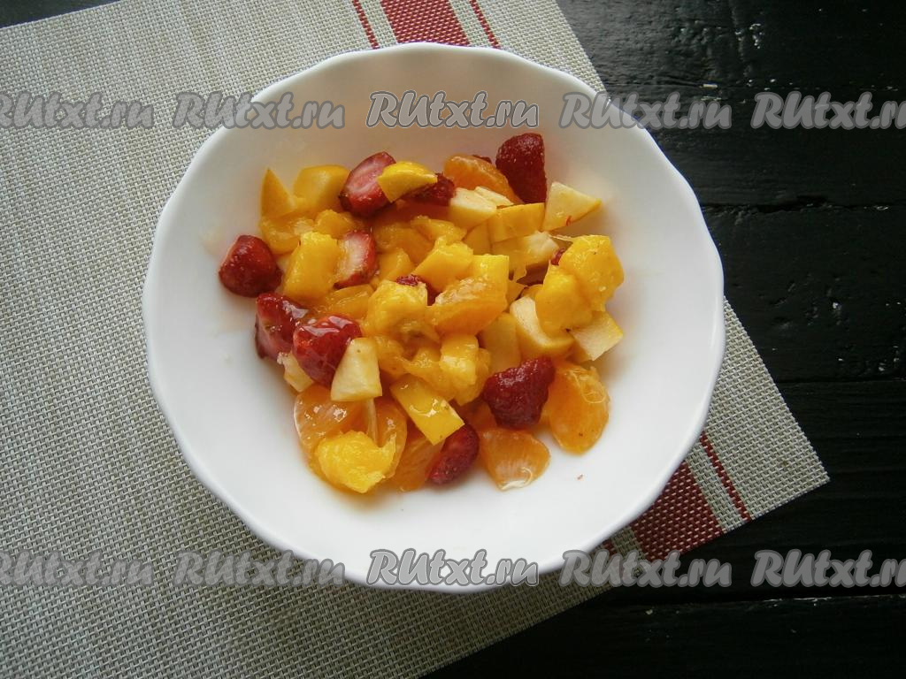 Половину нарезанного манго отложить в сторону (мы её будем использовать для приготовления заправки для фруктового салата). Вторую половину нарезанного манго поместить в миску, добавить 5-6 ягод клубники, разрезанных на 2-4 части, и разрезанные на 2 части дольки мандарина.