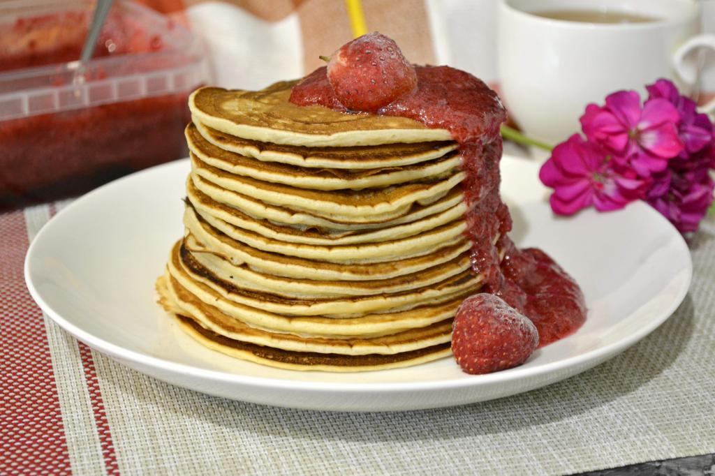 Таким образом пожарить на сухой сковороде все панкейки, складывая их стопочкой на тарелку. Вкуснейшие панкейки, приготовленные на ряженке, полить джемом или мёдом, сиропом, украсить свежими ягодами и подать к столу.