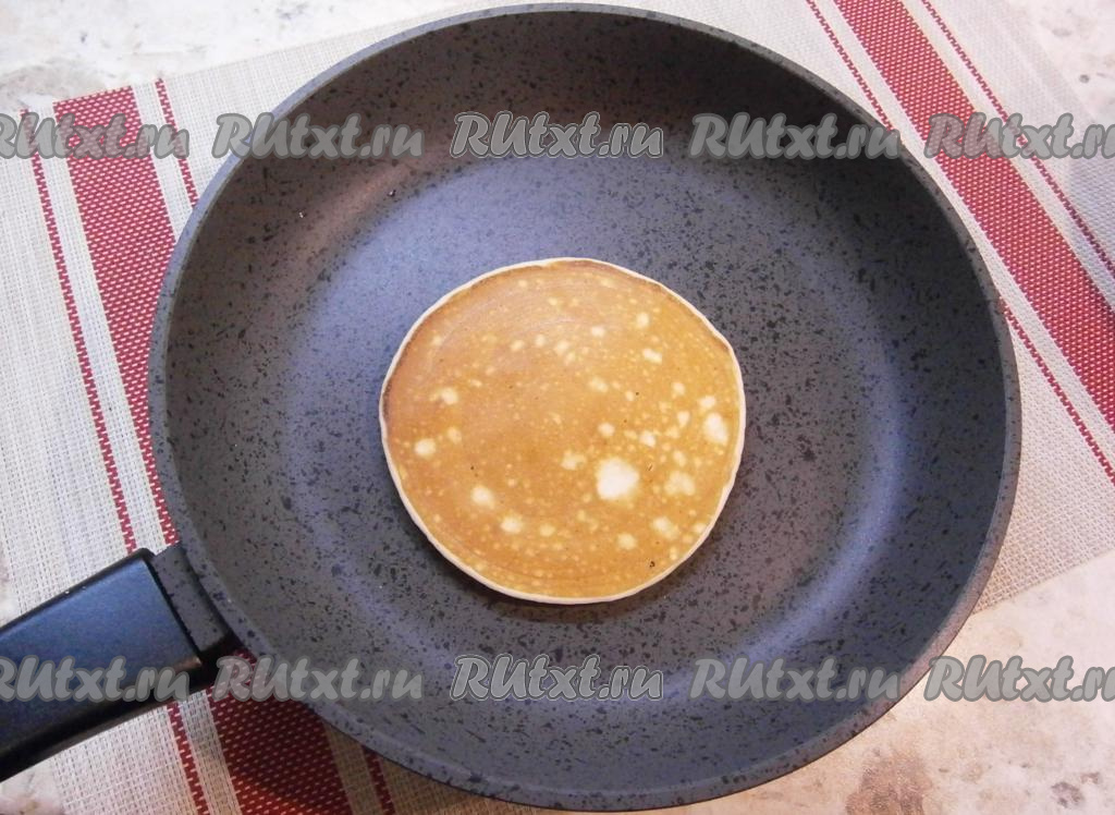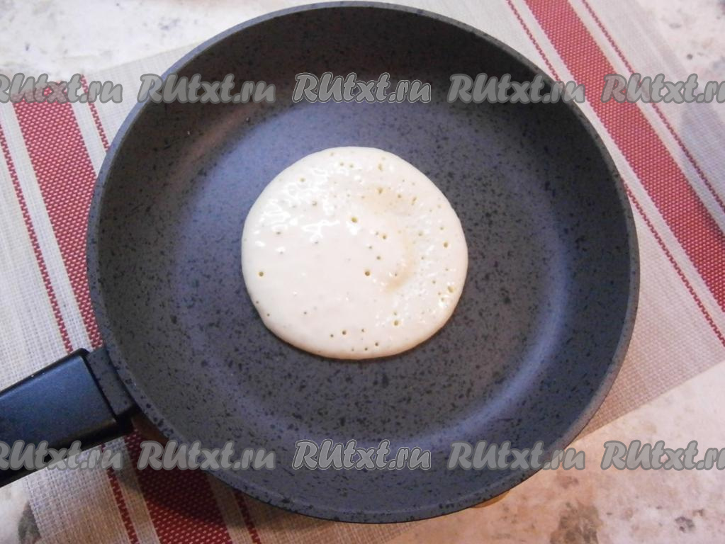 Сковороду разогреть, никакого жира не добавлять (панкейки выпекаются на сухой сковороде). В центр сковороды налить 2-3 столовые ложки теста, придавая форму круга. На среднем огне жарить панкейк до румяного цвета снизу и характерных дырочек сверху.