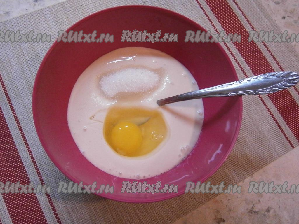К ряженке добавить яйцо, щепотку соли, ванильный сахар и сахар.