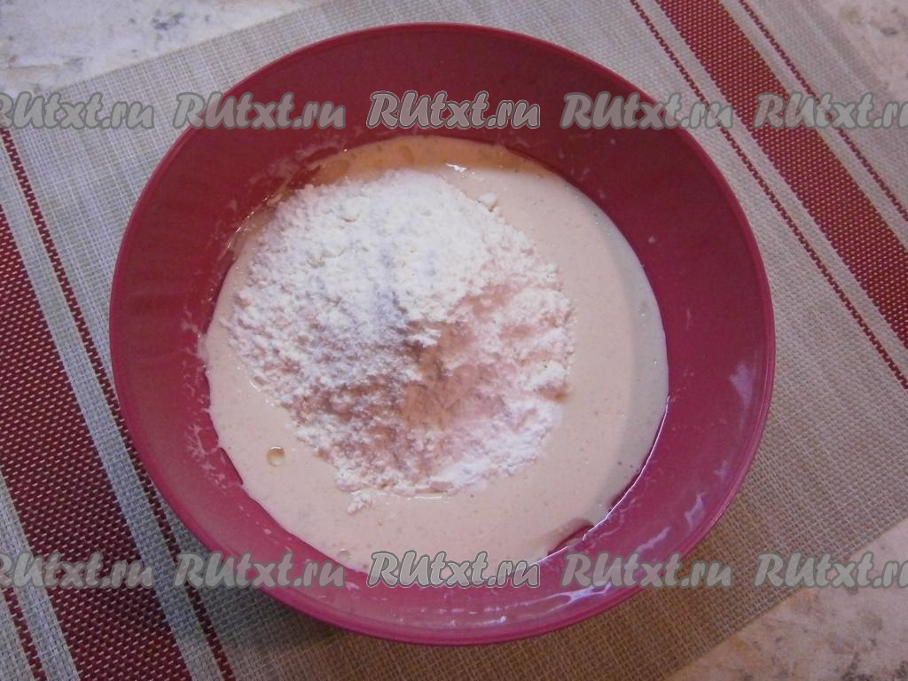 Снова перемешать, всыпать муку с разрыхлителем, перемешать венчиком тесто для панкейков.