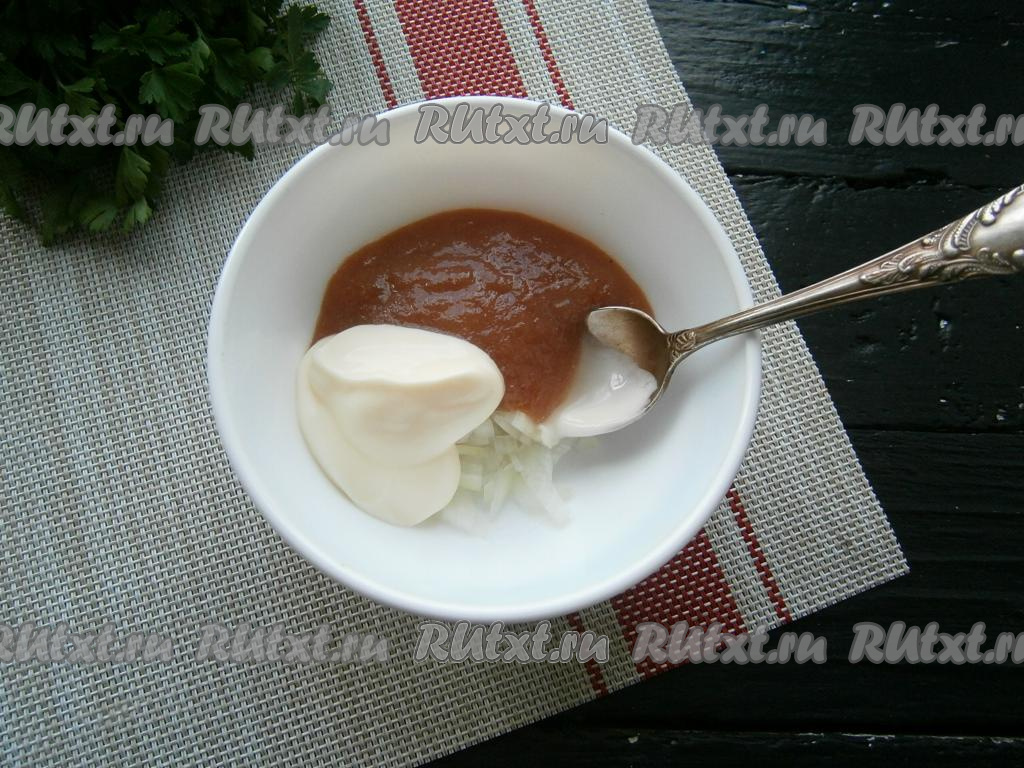Репчатый лук очистить и очень мелко нарезать, добавить к нему майонез и солёную икру трески.
