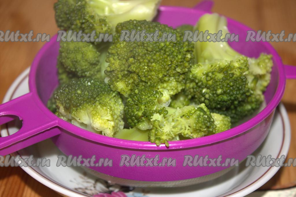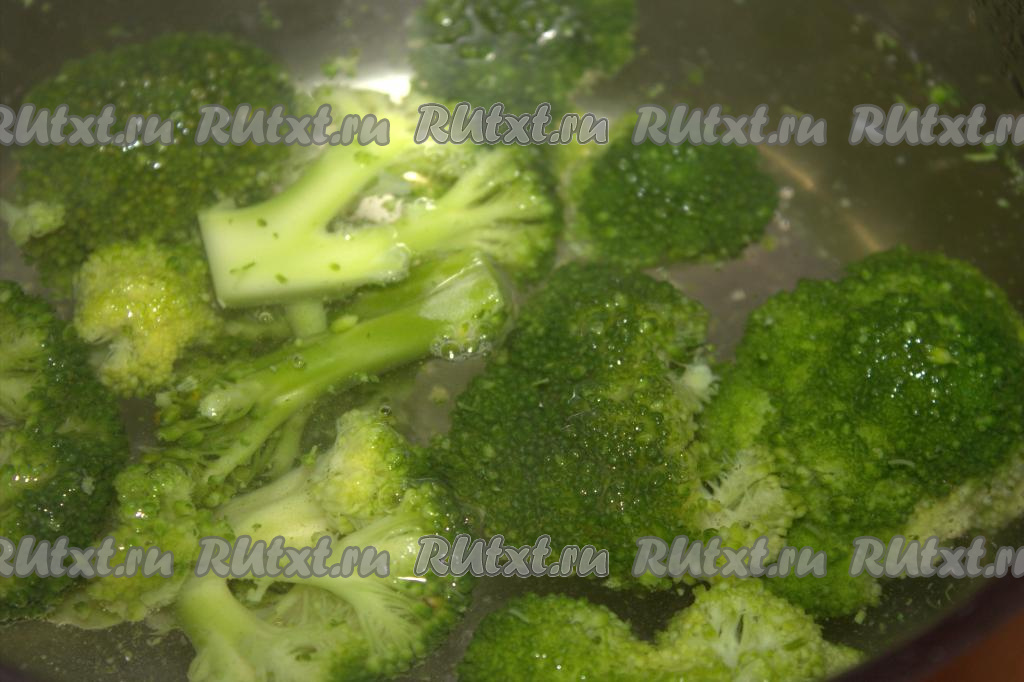 Свежую капусту брокколи промыть под проточной водой, разобрать на соцветия, поместить в кастрюлю с кипящей и слегка подсоленной водой. Затем с момента закипания уменьшить огонь и варить капусту 5-7 минут. В этом рецепте я использовала замороженную брокколи, предварительно ее не размораживала, выложила в закипевшую подсоленную воду и с момента закипания варила на среднем огне 10 минут. Соцветия капусты должны стать достаточно мягкими, но при этом не должны развариться.