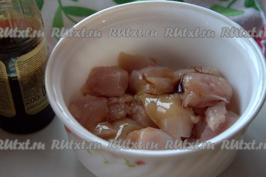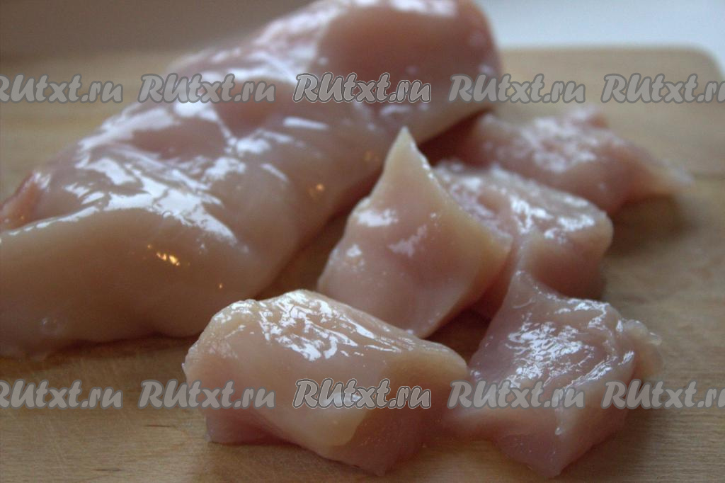 Куриную грудку отделить от кости, вымыть, нарезать на кусочки одинакового размера (очень мелко нарезать не нужно, лучше если кусочки будут среднего размера).