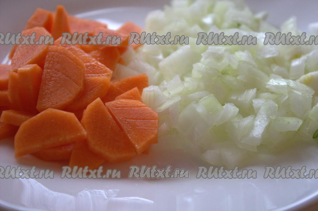 Лук и морковь очистить. Нарезать морковь полукольцами, лук - мелкими кубиками.