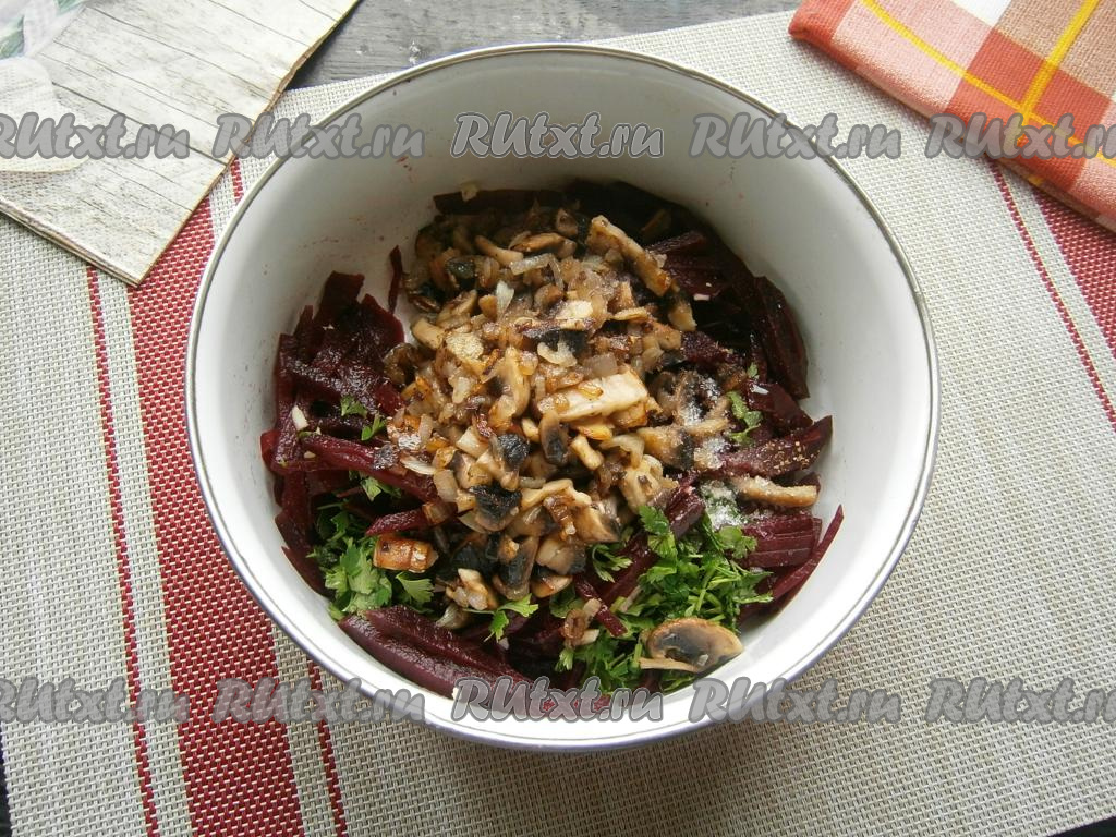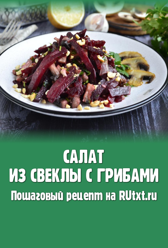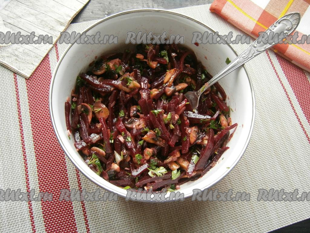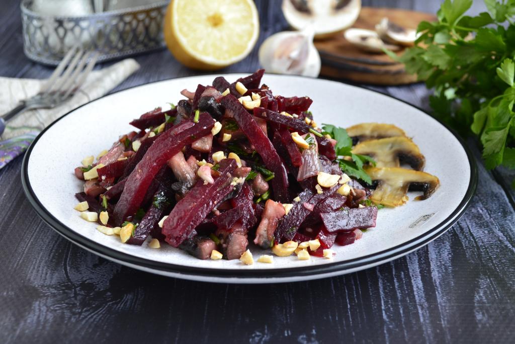 Салат, приготовленный из свеклы с грибами, - простой, очень вкусный, полезный салатик, которым можно дополнить основное блюдо. Для тех кто соблюдает Пост или диету, такой салатик можно съесть на ужин - он достаточно сытный. В рецепте я использовала покупные шампиньоны, можете заменить их на лесные грибы, предварительно отваренные в течение 25-30 минут или вешенки, а вместо арахиса подойдут грецкие орехи, кедровые орешки, фундук или миндаль.