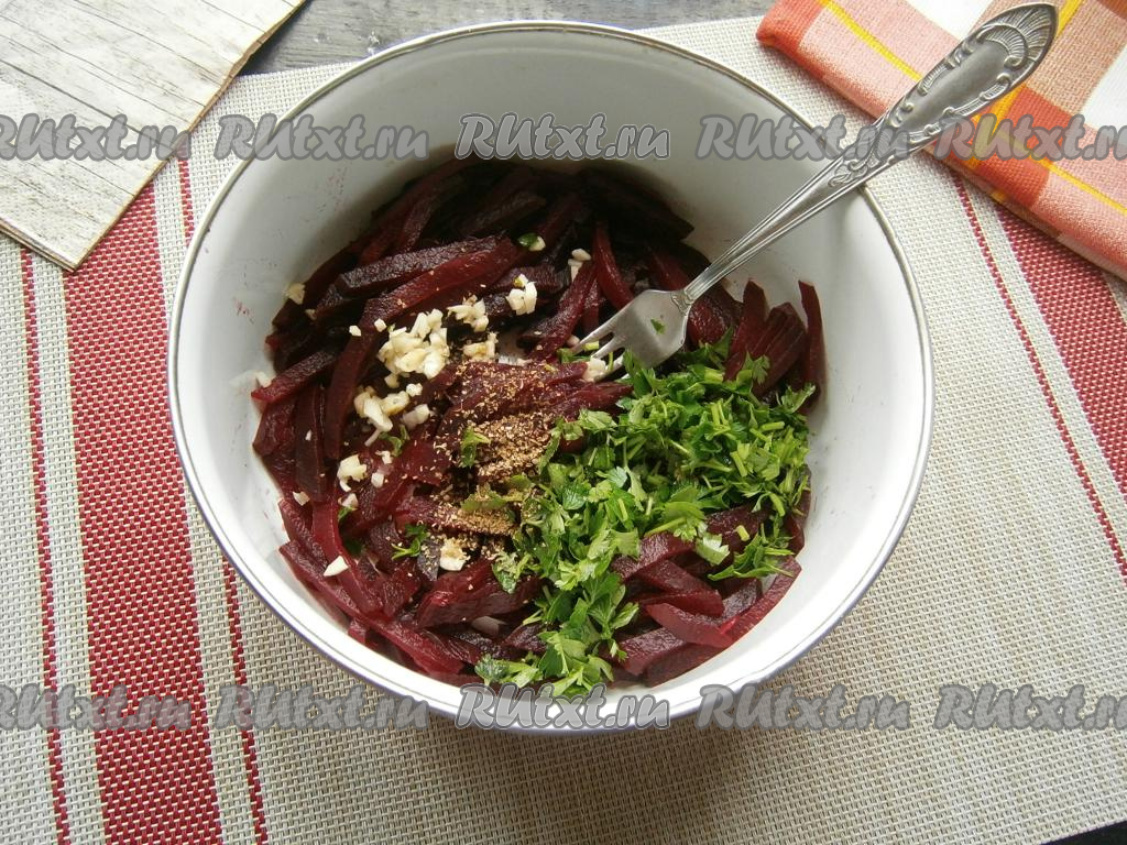 К свекле добавить измельчённую петрушку, мелко нарезанный чеснок и всыпать кориандр.