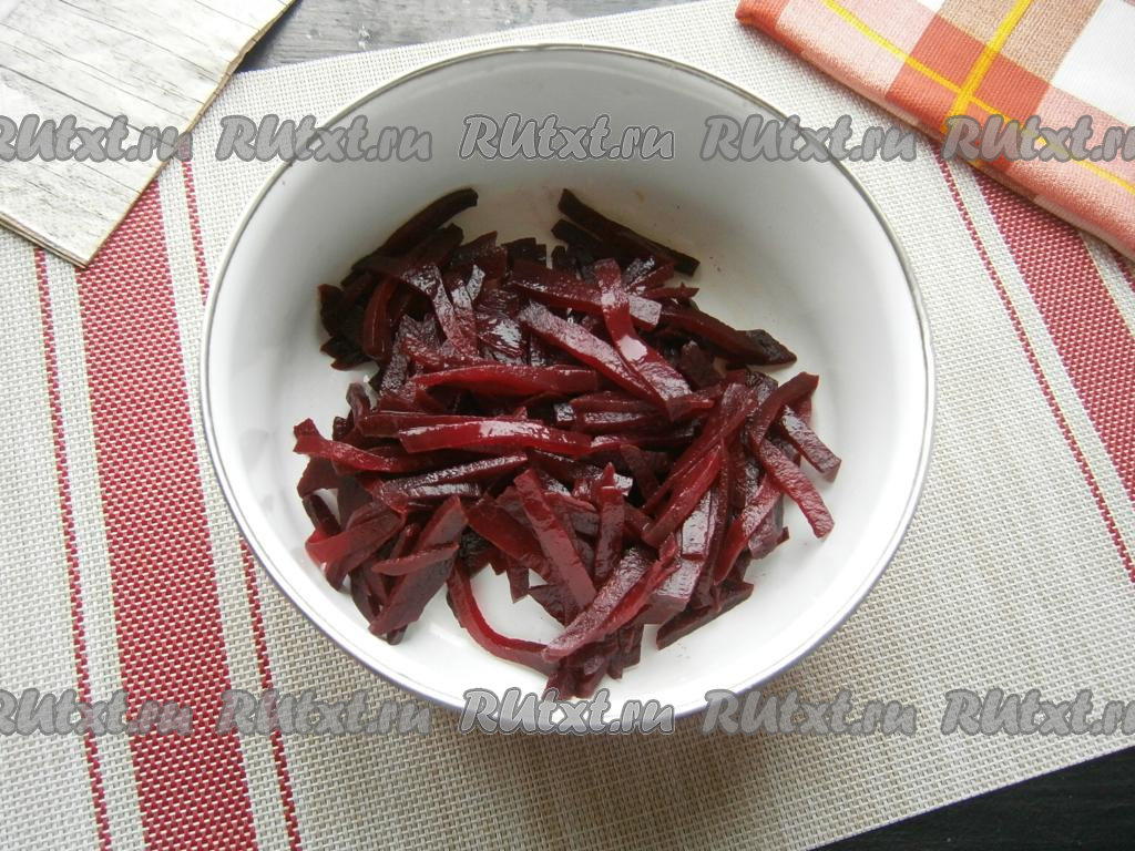 Свеклу предварительно отварить в течение 1 часа с момента закипания воды, остудить, очистить и нарезать соломкой. Сбрызнуть свеклу лимонным соком, перемешать.