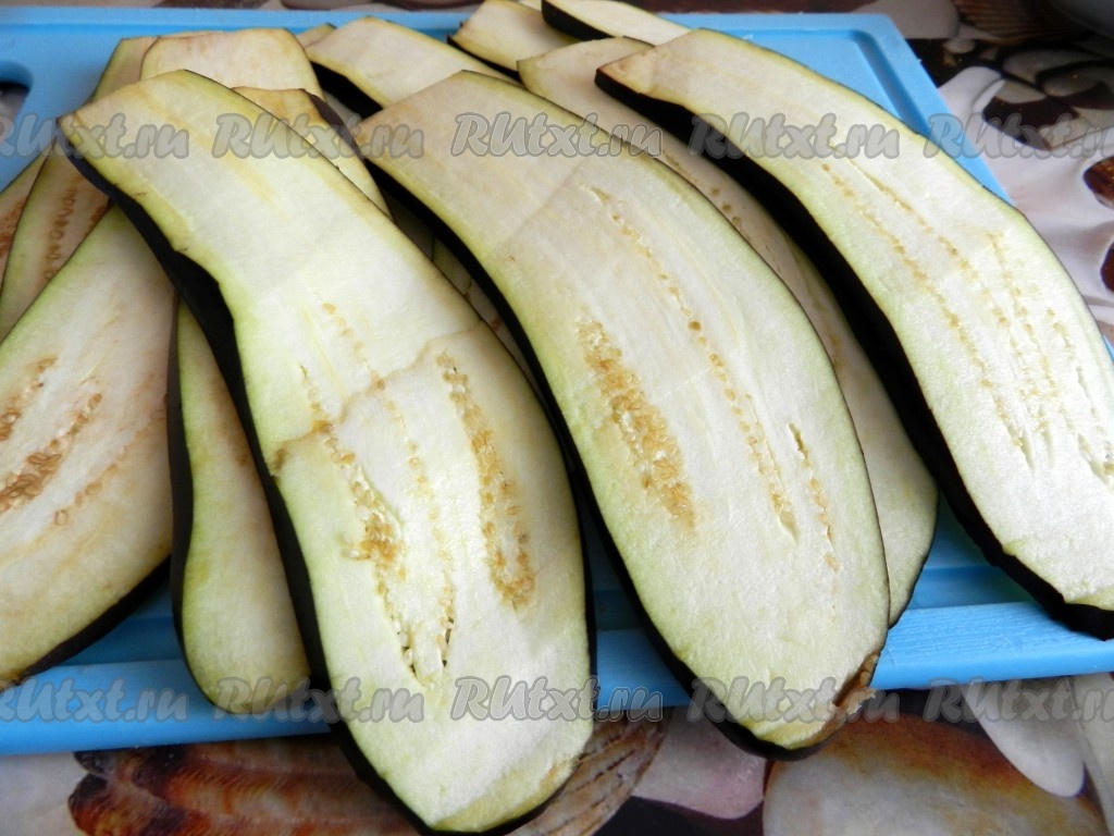Баклажаны вымыть, нарезать вдоль на ломтики толщиной 4-5 миллиметров, посыпать солью и оставить на 20 минут. Затем промыть и обсушить.