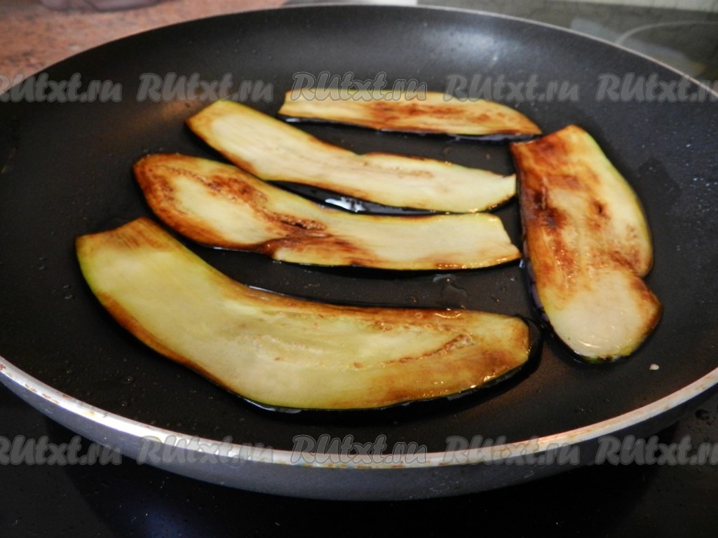 В сковороде разогреть растительное масло, выложить несколько ломтиков баклажанов в один слой и обжарить их до румяности с двух сторон.