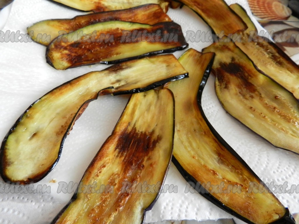 Обжаренные баклажаны выложить на бумажное полотенце (или салфетку), чтобы удалить лишнее масло. Постепенно обжарить все ломтики баклажанов.