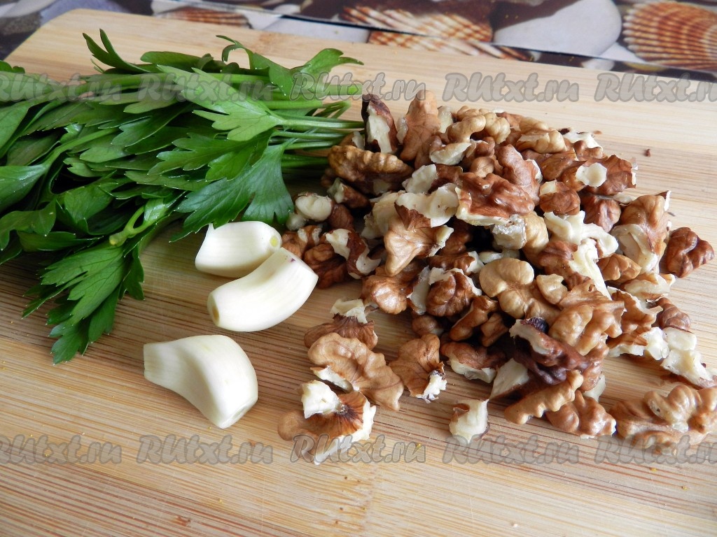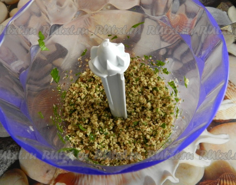 Орехи измельчить в блендере вместе с чесноком и петрушкой до получения однородной массы.