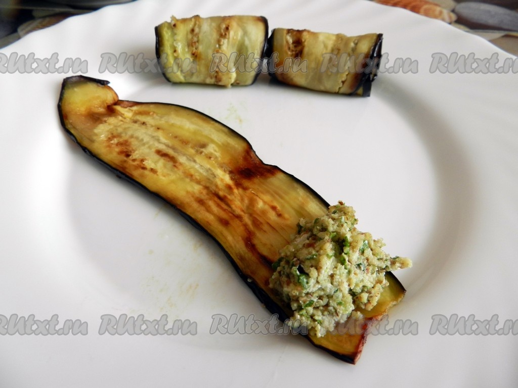 На ломтик баклажана выложить часть орехово-чесночной массы и скрутить в рулетик, начиная со стороны с начинкой.