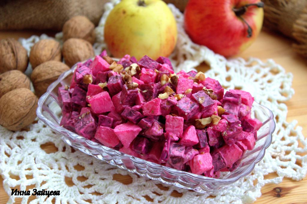 Предлагаю вам попробовать салат из свеклы с добавлением грецких орехов и яблока. Вкус салатика получается очень гармоничным, нежным и, в тоже время, пикантным. Яблоки придают блюду кислинку, а благодаря грецким орехам салат получается достаточно сытным. Такой салатик прекрасно разнообразит меню, попробуйте!