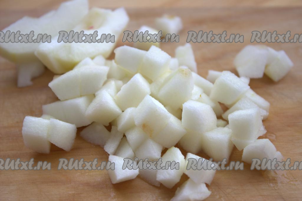 Очистить яблоко от кожуры и семян, нарезать маленькими кубиками. Для того чтобы нарезанное яблоко не потемнело, его нужно сбрызнуть лимонным соком.