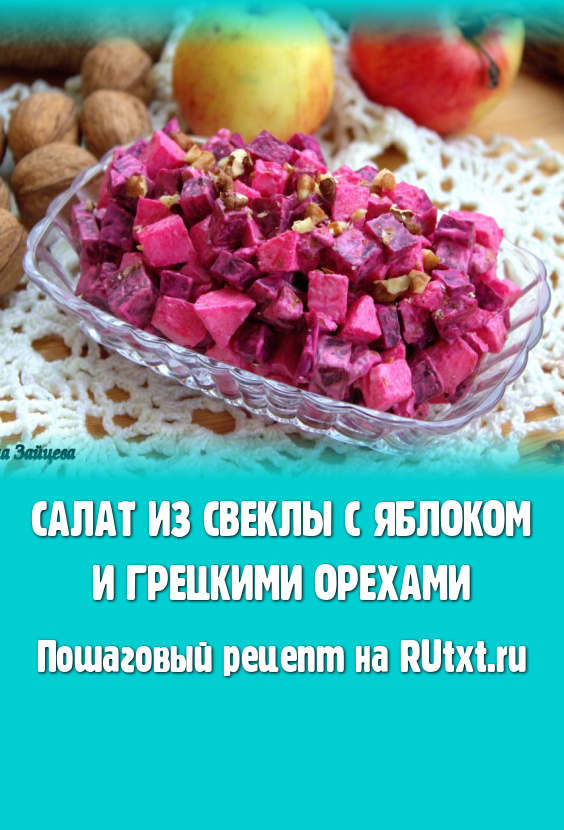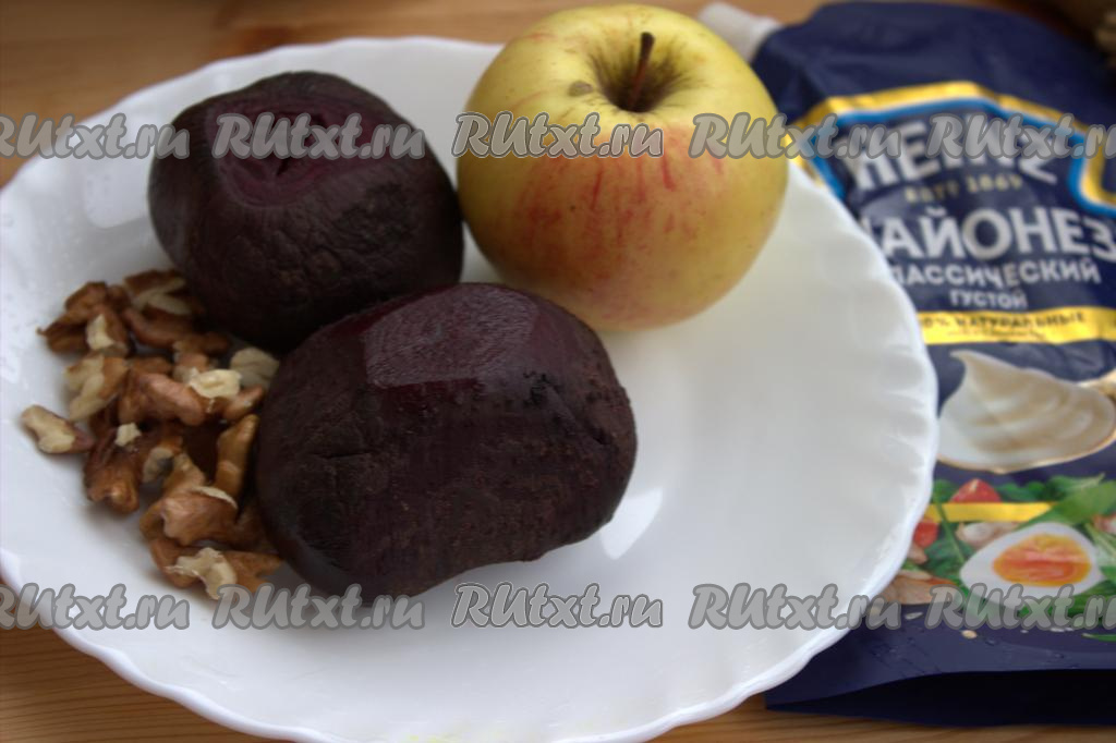 В миске соединить нарезанные свеклу и яблоки, добавить измельчённые грецкие орехи, перемешать и заправить салат майонезом (или несладким йогуртом).