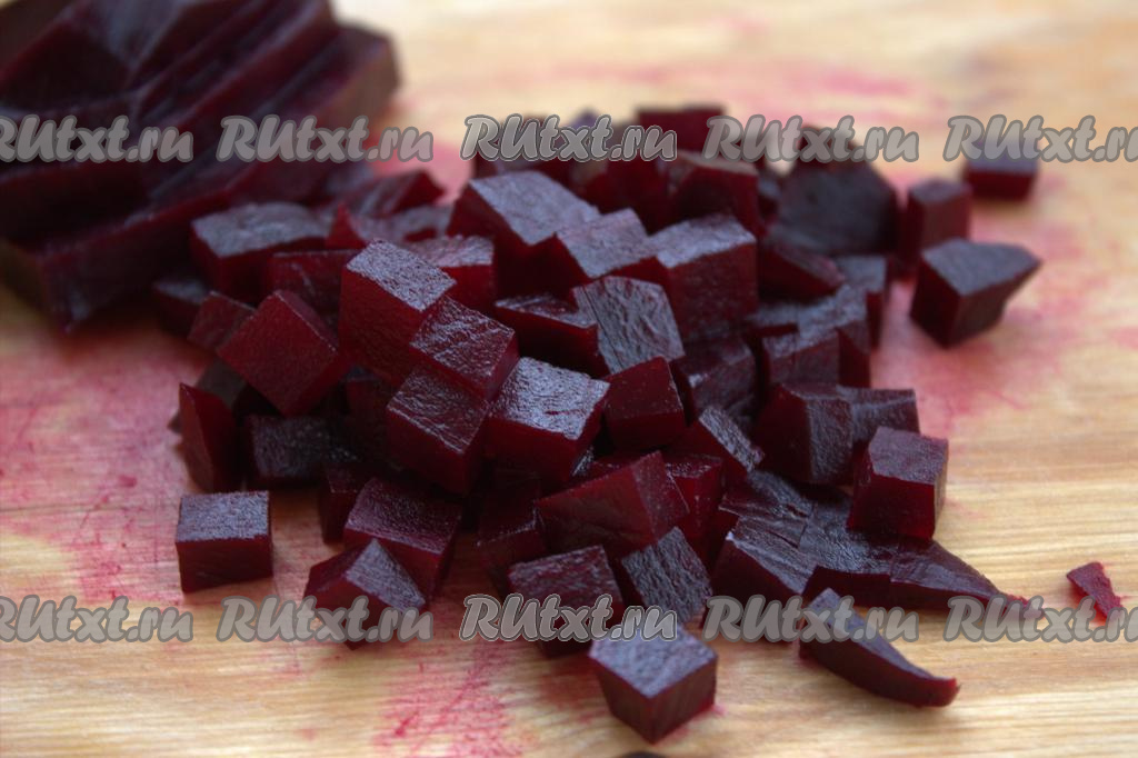 Неочищенную свеклу хорошо вымыть под проточной водой при помощи щётки, поместить в кастрюлю, залить холодной водой. После закипания воды уменьшить огонь, накрыть кастрюлю крышкой и варить свеклу на среднем огне 40-50 минут. Время варки зависит от сорта и размера свеклы. Готовая свекла будет легко прокалываться вилкой (или ножом). Варёную свеклу, достав из воды, остудить, очистить, а затем нарезать на небольшие кубики.