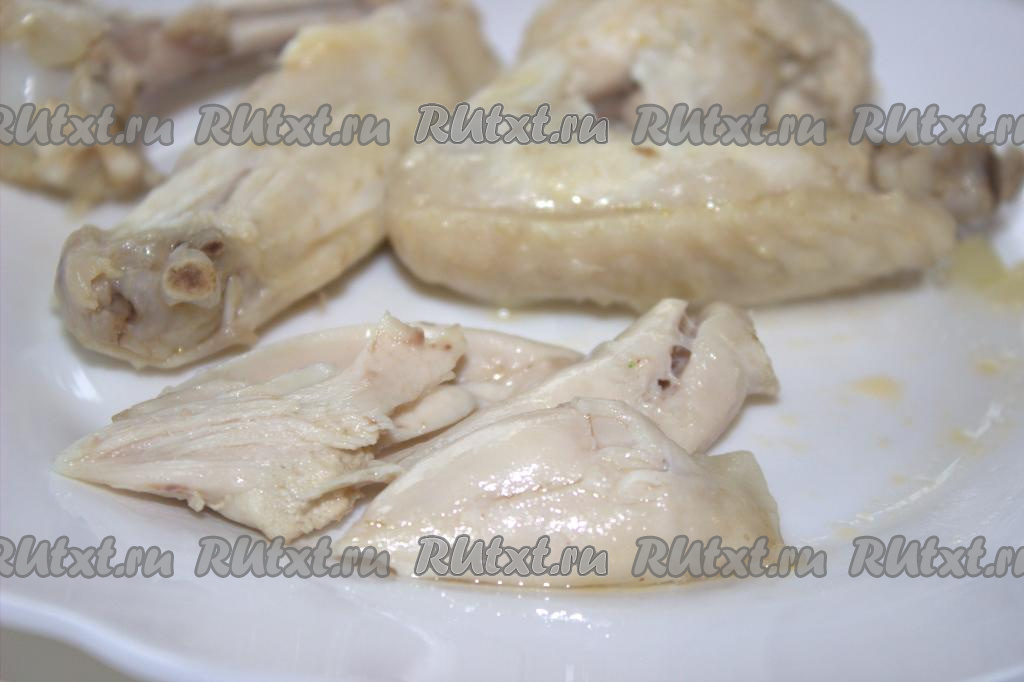 Из супа вынуть кусочки курицы, отделить мясо от костей и вернуть в кастрюлю.
