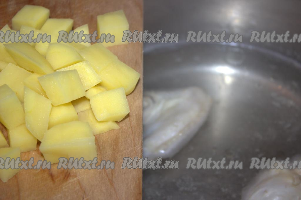 Пока варится бульон, очистить картошку, морковь и лук. Картофель нарезать кубиками среднего размера, выложить в кипящий куриный бульон и варить на среднем огне минут 15.