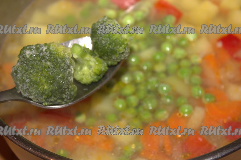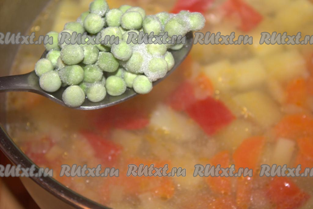 Зелёный горошек, не размораживая, добавить в кастрюлю (если вы готовите суп с консервированным горошком, тогда предварительно необходимо будет слить из банки жидкость).