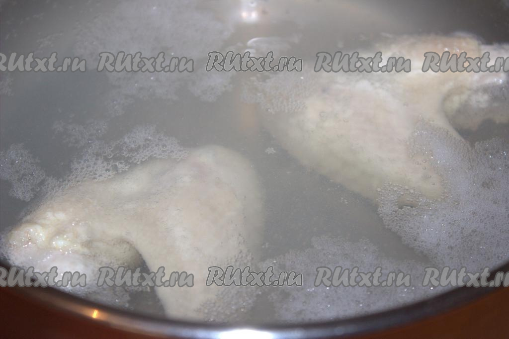 Кусочки курицы (я варила суп из куриных крылышек) хорошо вымыть, поместить в кастрюлю, залить 3 литрами холодной воды и поставить на огонь. После закипания бульона уменьшить огонь, снять пену, немного посолить и продолжить варить в течение 20 минут.