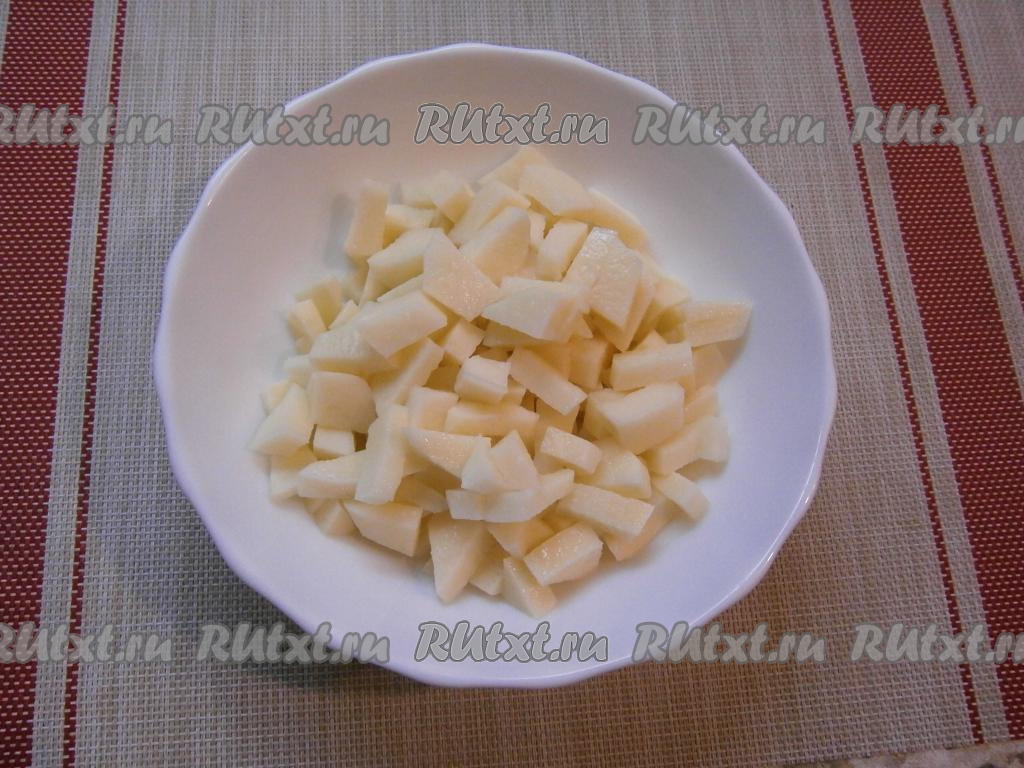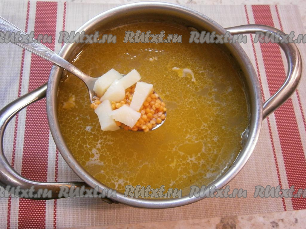 В кипящий куриный бульон добавить картофель и, если нужно, посолить, после закипания уменьшить огонь до минимума. Варить картошку 10 минут, после чего всыпать в кастрюлю красную чечевицу и варить суп ещё 15 минут.