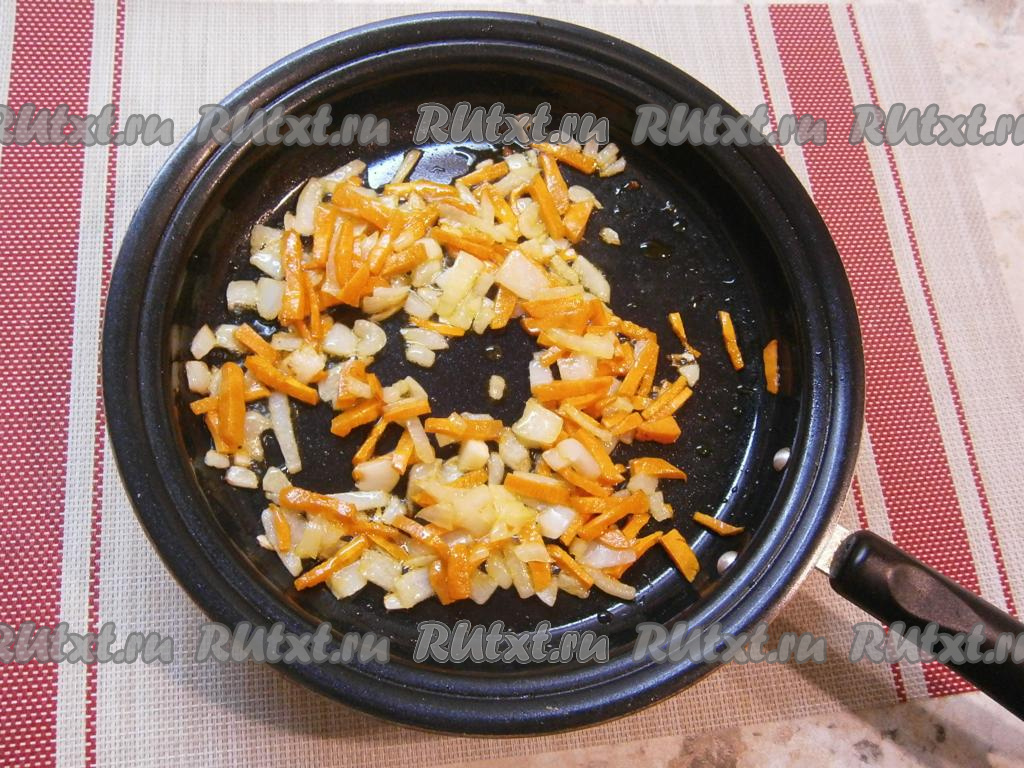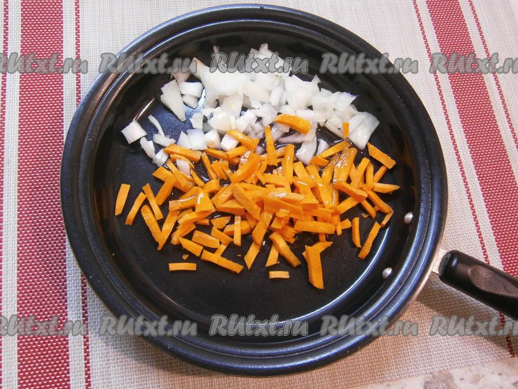 Очищенную морковь нарезать соломкой, очищенный лук - произвольно, выложить овощи в сковороду с растительным маслом.