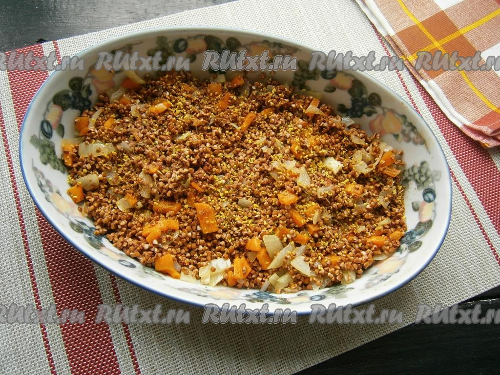 Добавить в гречневую крупу обжаренные овощи, мелко нарезанный чеснок, соль и специи, перемешать.