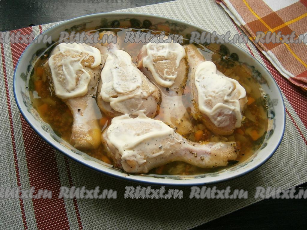 Голени не будут полностью покрыты жидкостью, их сверху поперчить и смазать майонезом (или сметаной).